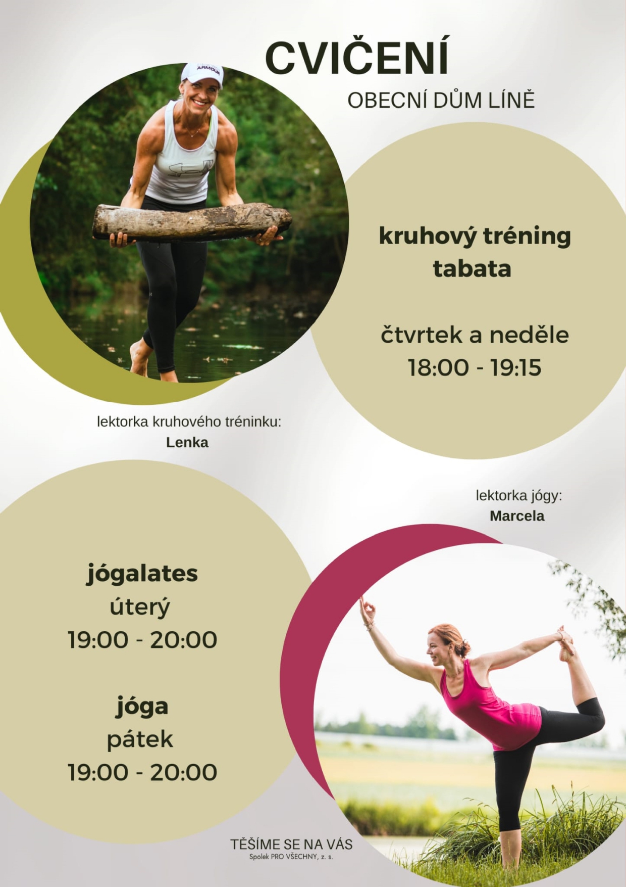 Oznamujeme Vám tímto, že od září 2025 bude v Obecním domě LÍNĚ zahájen pravidelný kruhový trénink, který se bude konat každý čtvrtek a neděli od 18:00 do 19:15 pod vedením lektorky Lenky. Dále se můžete těšit každé úterý od 19:00 do 20:00 na jógalates a každý pátek od 19:00 do 20:00 na jógu pod vedením lektorky Marcely.