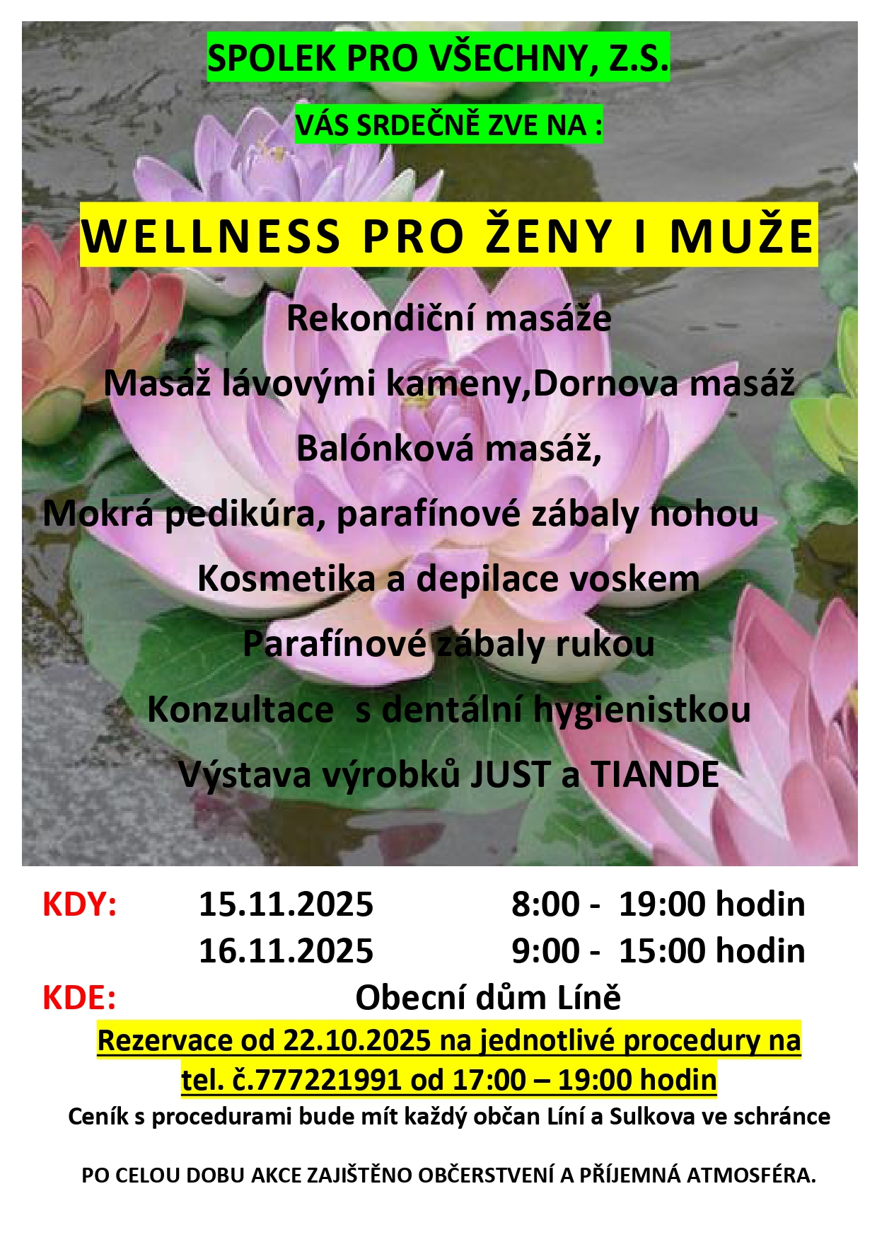 Srdečně Vás zveme na pravidelnou akci s názvem "WELLNESS PRO ŽENY I MUŽE", která se uskuteční ve dnech 15.11.2025 od 8:00 do 19:00 a 16.11.2025 od 9:00 do 15:00 v obecním domě Líně. Můžete se těšit na spousty různých masáží a zábalů, manikúru, pedikúru nebo i na informace od dentální hygienistky a nějaké to občerstvení. Také zde budou...
