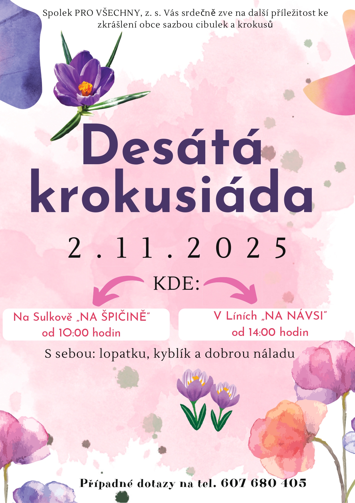 Srdečně Vás zveme na další KROKUSIÁDU, která proběhne v neděli 02.11.2025. Pojďme společně zkrášlit naši obec a zasázet cibulky Krokusů. Akce bude probíhat od 10:00 na Sulkově (sraz na "Špičině") a od 14:00 v Líních (sraz na návsi). Vítáni jsou všichni včetně dětí. S sebou si prosím nezapomeňte pracovní rukavice, zahradní náčiní a dobrou náladu....