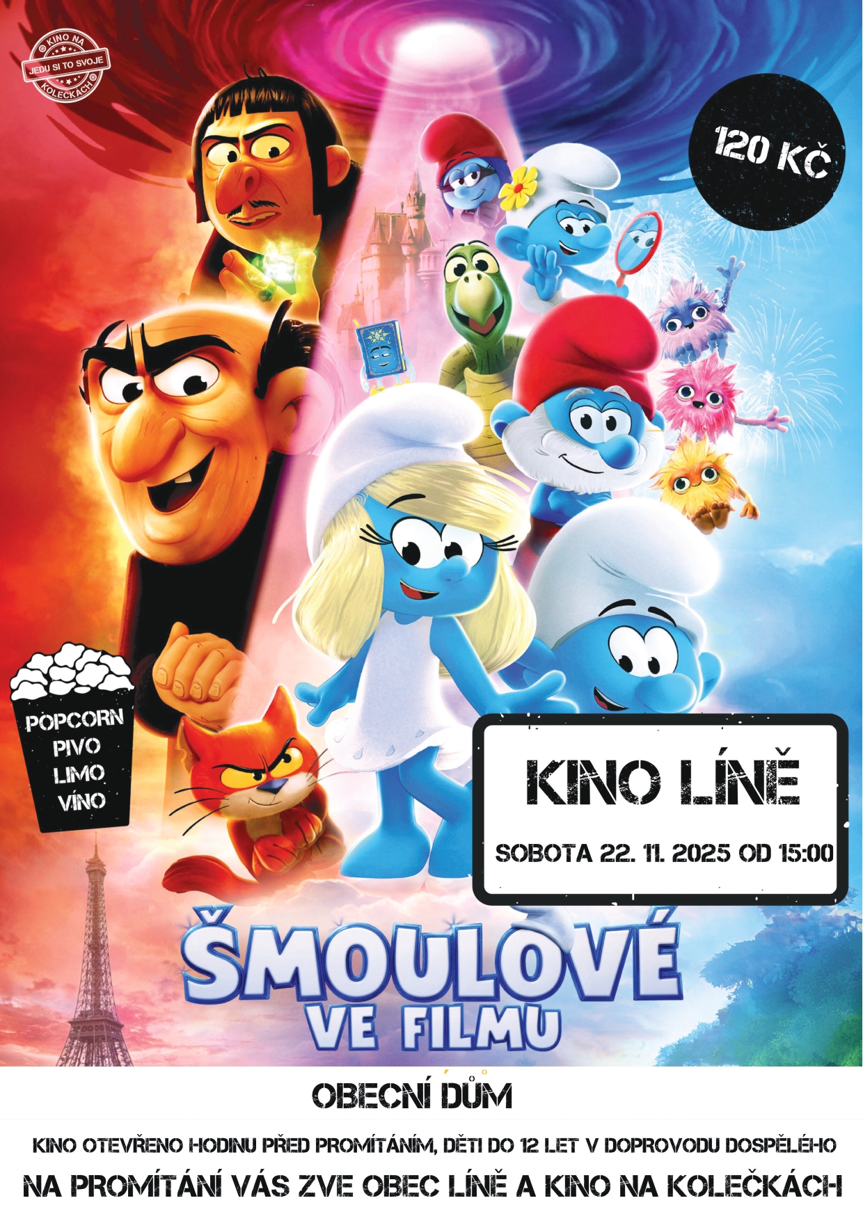 Srdečně Vás zveme na promítání filmu "Šmoulové ve filmu", které proběhne v sobotu 22.11.2025 od 15:00 v Obecním domě Líně. Vstupné 120.-Kč. Kino otevřeno hodinu před promítáním. Těšíme se na Vás společně s obcí Líně a Kinem na kolečkách.