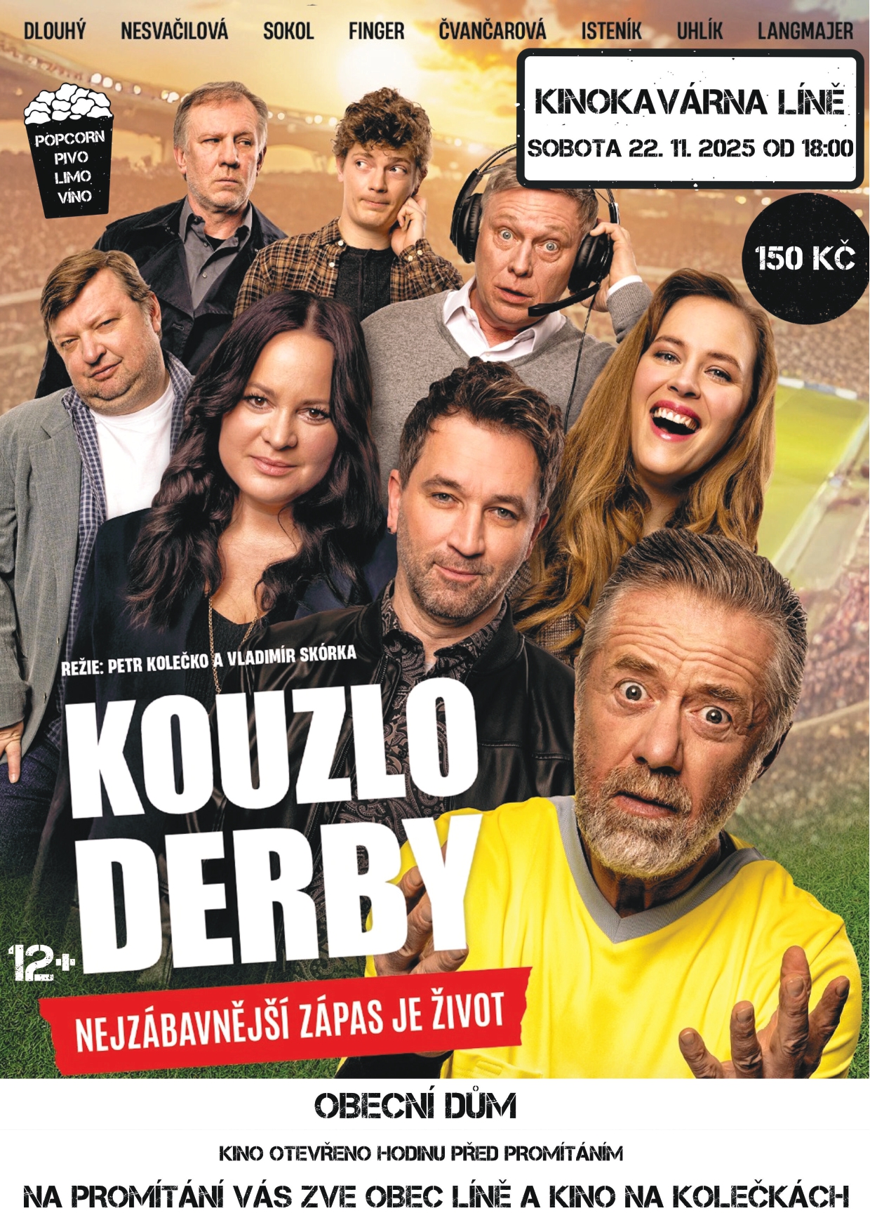 Srdečně Vás zveme na promítání filmu "Kouzlo derby", které proběhne v sobotu 22.11.2025 od 18:00 v Obecním domě Líně. Vstupné 150.-Kč. Kino otevřeno hodinu před promítáním. Těšíme se na Vás společně s obcí Líně a Kinem na kolečkách.