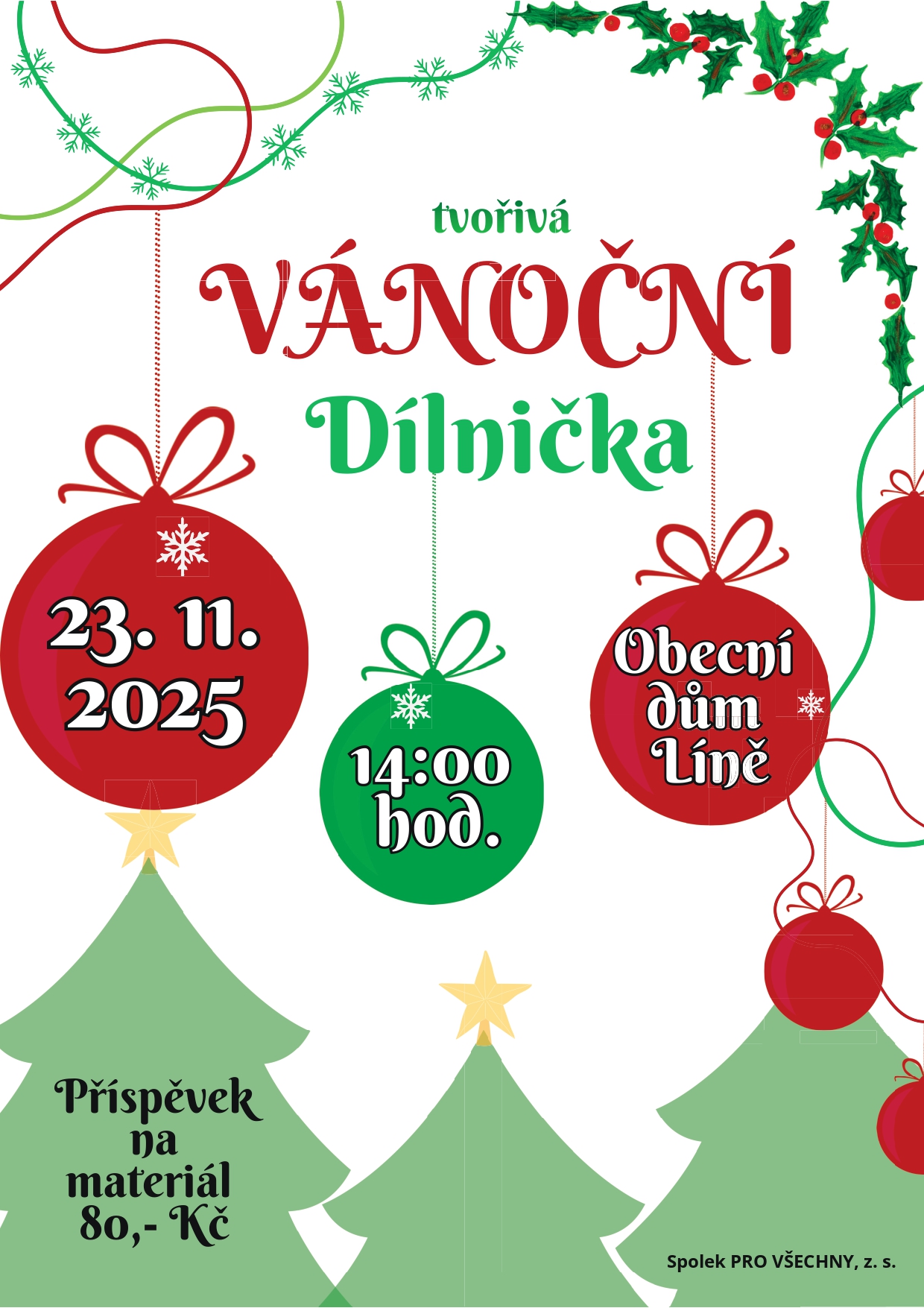Srdečně Vás zveme na akci "Vánoční dílnička", která proběhne v neděli 23.11.2025 od 14:00 v obecním domě Líně. Přijďte si vytvořit krásné vánoční dekorace a naladit se vánoční náladou. Příspěvek na materiál 80 Kč. Těšíme se na Vás