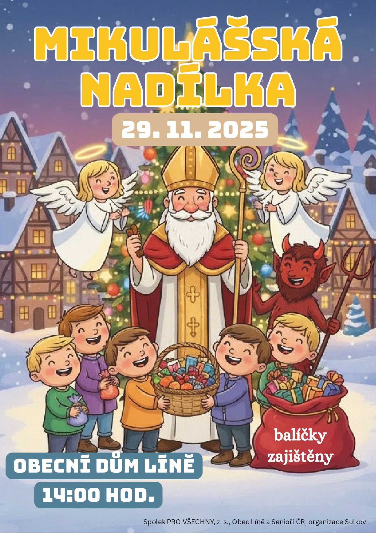 Srdečně Vás zveme na akci "Mikulášská nadílka", která proběhne v sobotu 29.11.2025 od 14:00 v obecním domě Líně. Přijďte si zatančit a pobavit se s Mikulášem, čerty a anděly. Odměna Vás nemine